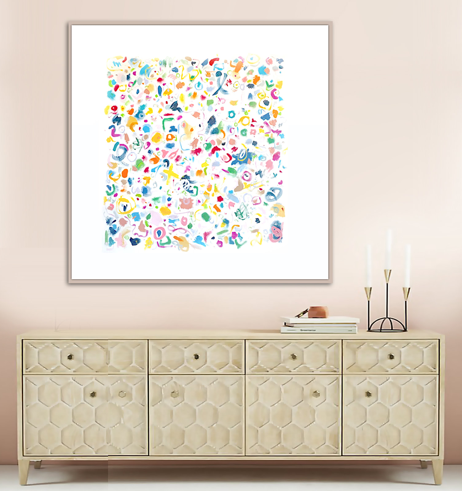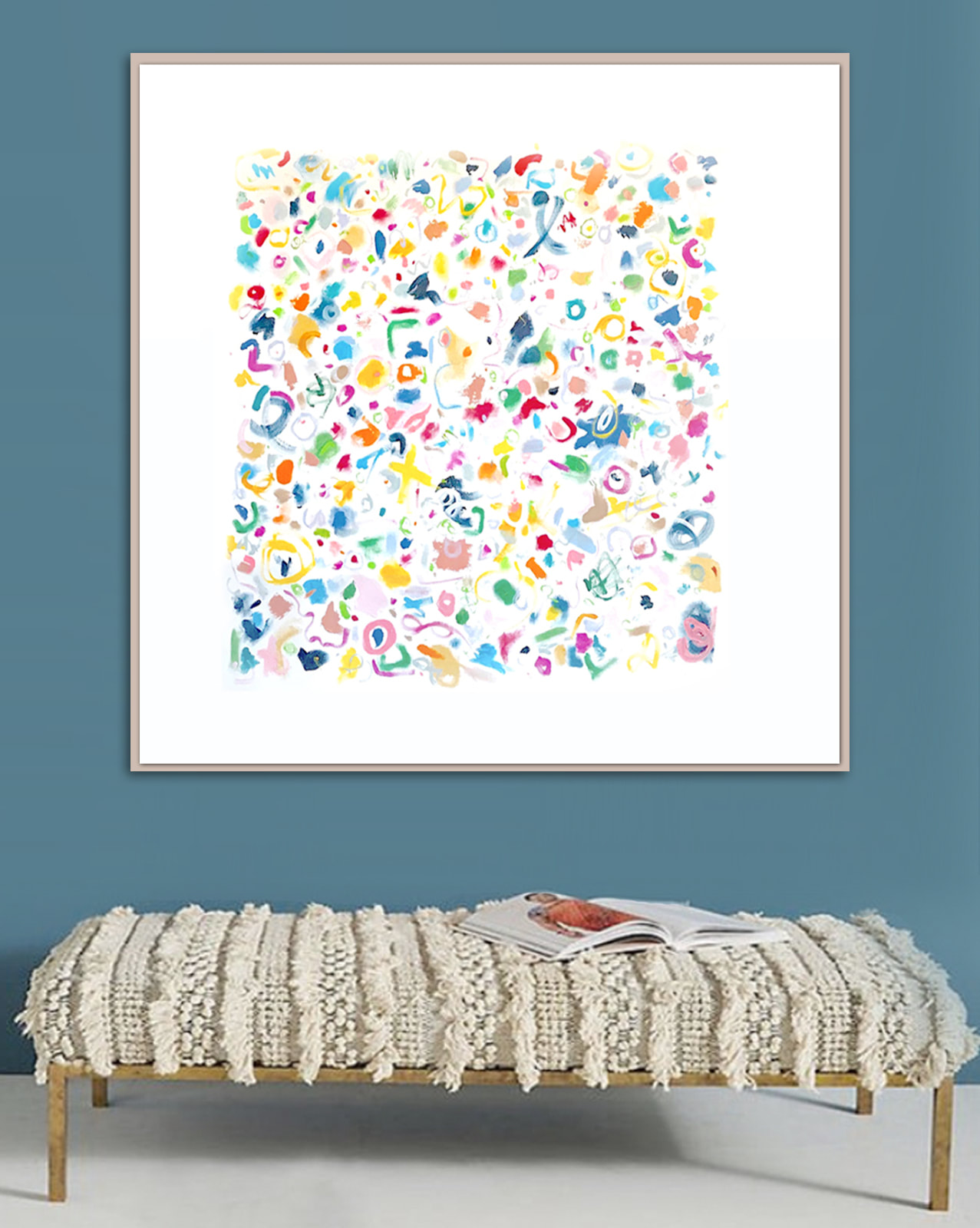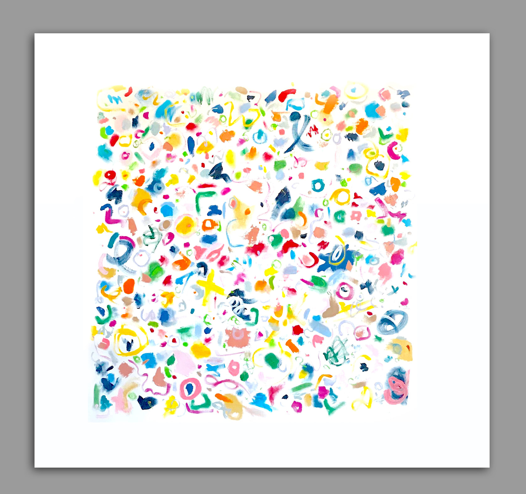 Joyous, celebratory experiments in mark marking. Acrylic on canvas. As with most of my art, this painting is signed on the back and can be displayed from any direction.
