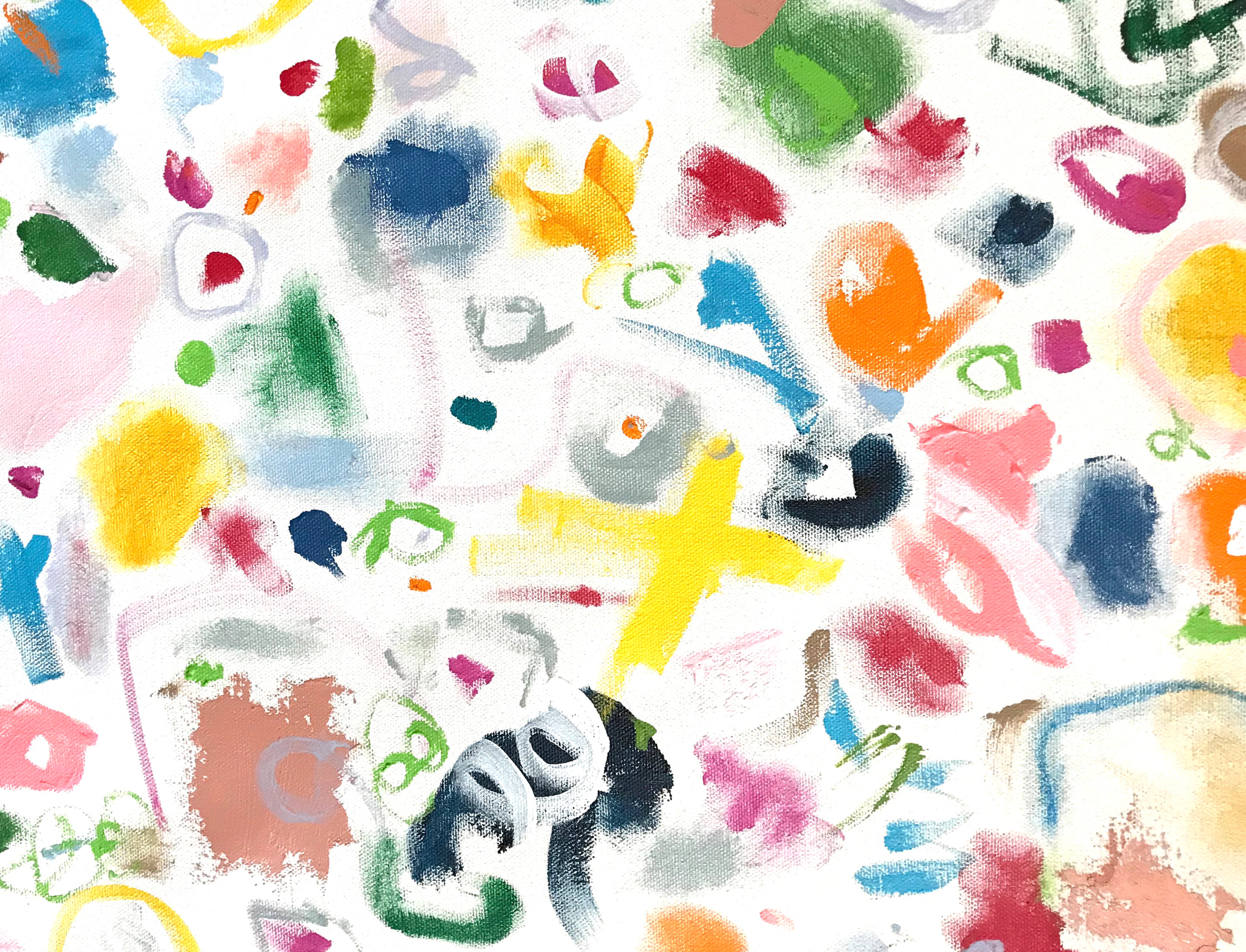 Joyous, celebratory experiments in mark marking. Acrylic on canvas. As with most of my art, this painting is signed on the back and can be displayed from any direction.