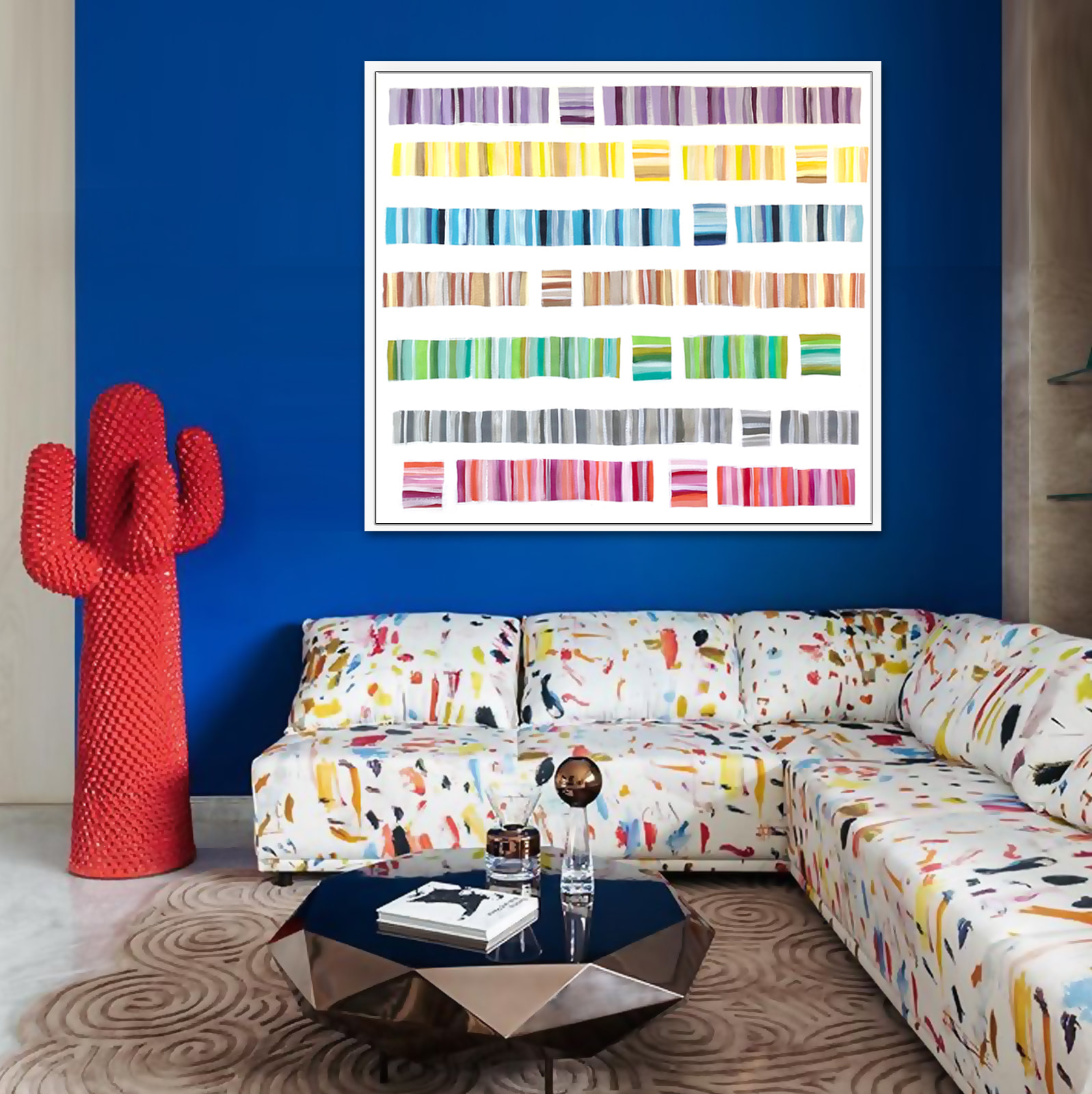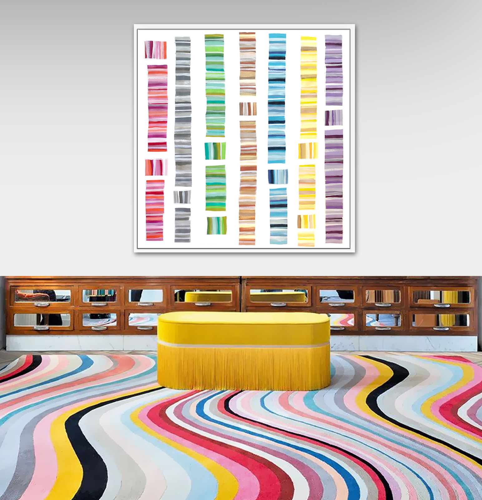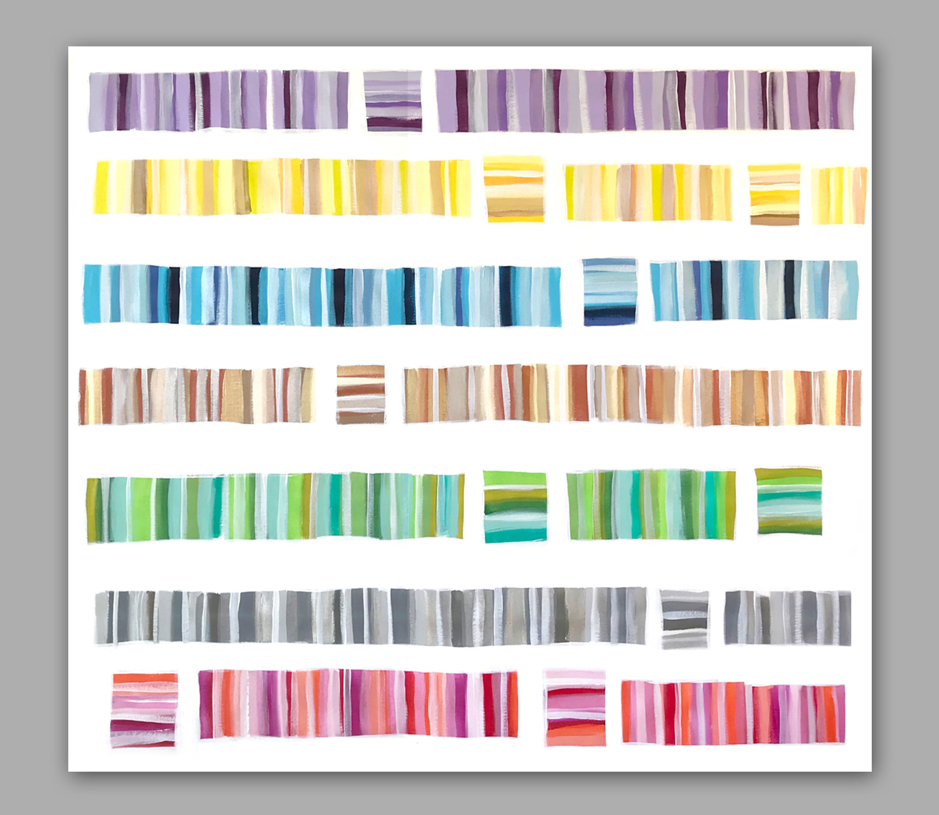 Part of my ongoing continuum series, a contemporary composition of ordered color. Shimmering, light-reflecting pearlescent tones provide a multidimensional effect. As with most of my art, this painting can be displayed from any direction. Acrylic on canvas.