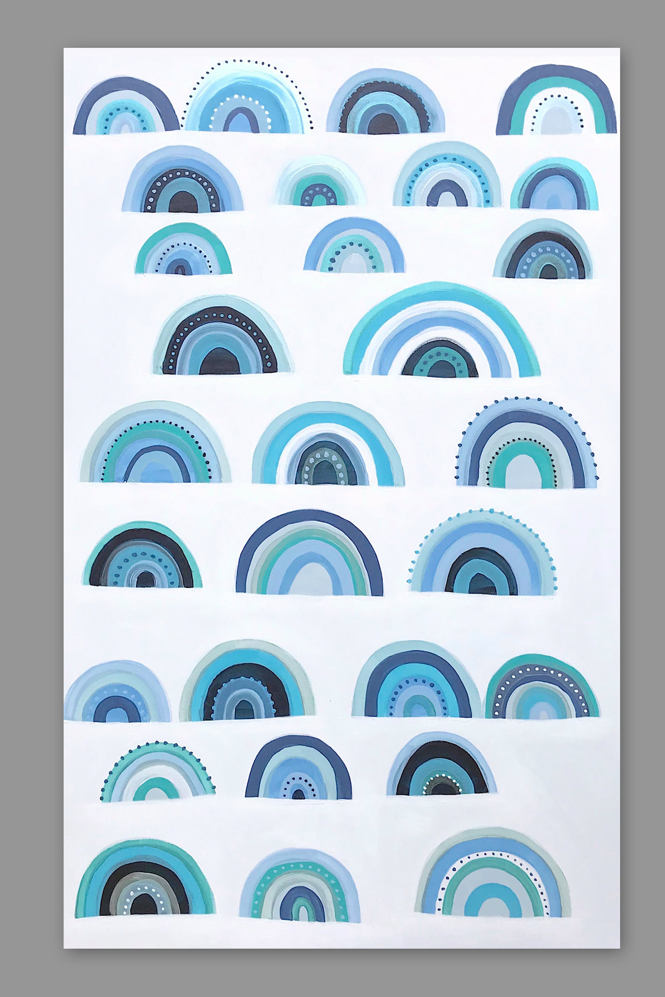A plethora of hopeful, whimsical rainbows in various blue tones. Subtle, pearlescent details shimmer in the light.